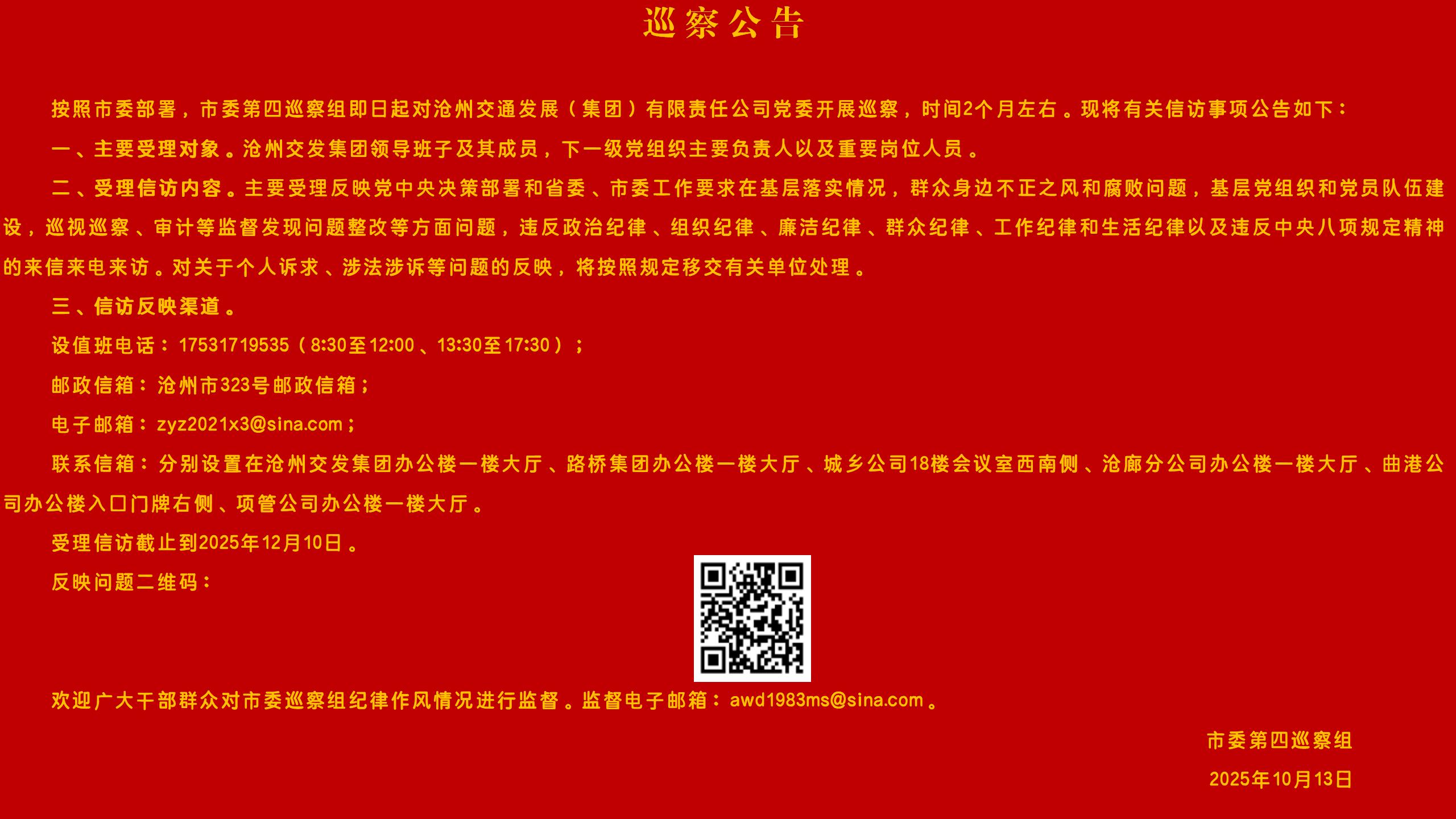 市委第四巡察組巡察 滄州交通發(fā)展(集團(tuán))有限責(zé)任公司黨委 工作動(dòng)員會召開 2025-10-17